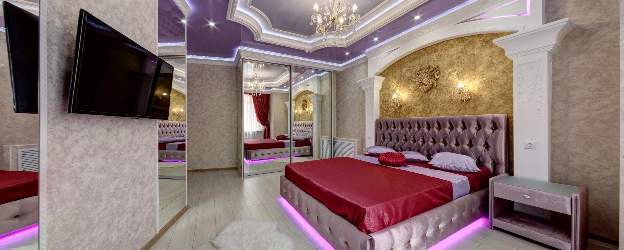 Отдельно стоит отметить "сердце" спальни - двуспальную кровать премиум класса, выполненную по проекту итальянского дизайнера Riccardo Bonvicini с ортопедическим основанием и внутренней LED-подсветкой. Дополнительно спальня оснащена просторным встроенным шкафом, создающим атмосферу зазеркалья, письменным столом, телевизором с кабельными аналами, тумбой для личных вещей, и другими декоративными деталями интерьера. Санузел отделан итальянской мозаикой и оснащен гидромассажной ванной. Безлимитный WiFi в качестве комплимента также повысит комфортность Вашего прибывания в апартаментах. Словом, добро пожаловать!
