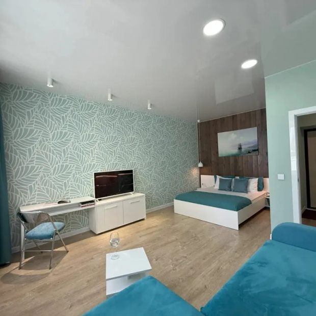 Квартира «Стильная с умным домом на берегу Ангары» находится в Иркутске. Квартира расположена на берегу реки Ангара. Интерьер выполнен в светлых зелёных и бирюзовых тонах. Гостиная с диваном, кроватью, постельным бельём и бытовой техникой. Кухня с микроволновой печью, холодильником и дополнительным диваном. Ванная комната с ванной, стиральной машиной, сантехникой, феном и гигиеническими принадлежностями. Система «умный дом» с голосовым управлением освещением, шторами, кондиционером и техникой.