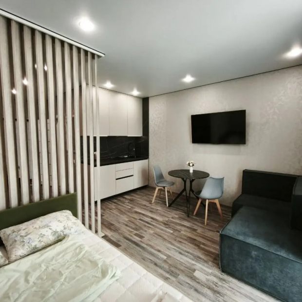 Трёхместная студия с балконом и с красивым видом из окна