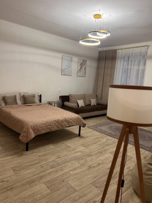 Однокомнатная студия Полностью оснащена для проживанияЗона спальни: 2сп кровать, смарт телевизор, Раскладывающийся диван для дополнительного места.Шкаф купе, зона кухни с комплектом посуды для пр…