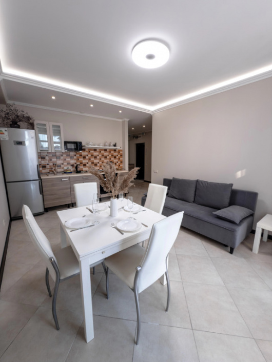 Апартаменты «Ajax на Цветочной» расположены в центре Адлера, в районе торгового центра. Неподалёку: магазины, клубы, кафе, рынки, столовые, пляж Мандарин (700 метров) и пляж Сочифорния (800 метров). Место подойдёт для семейного отдыха и тех, кто ценит близость к морю. Апартаменты с двумя спальнями и кухней-гостиной. Две спальни: Спальня №1: двуспальная кровать и балкон с видом на реку. Спальня №2: два двуспальных дивана и письменный стол, подойдёт для удалённой работы. Кухня-гостиная: двуспальный диван, кухонный гарнитур с необходимой посудой и техникой: холодильник, телевизор, микроволновая печь, электрическая плита с духовкой, кондиционер. Удобства: Размещение до 8 человек. Закрытая территория дома. Детская кроватка-манеж и стульчик для кормления предоставляются бесплатно, по запросу. Апартаменты расположены на 2 этаже, лифт не предусмотрен, нет пандуса.