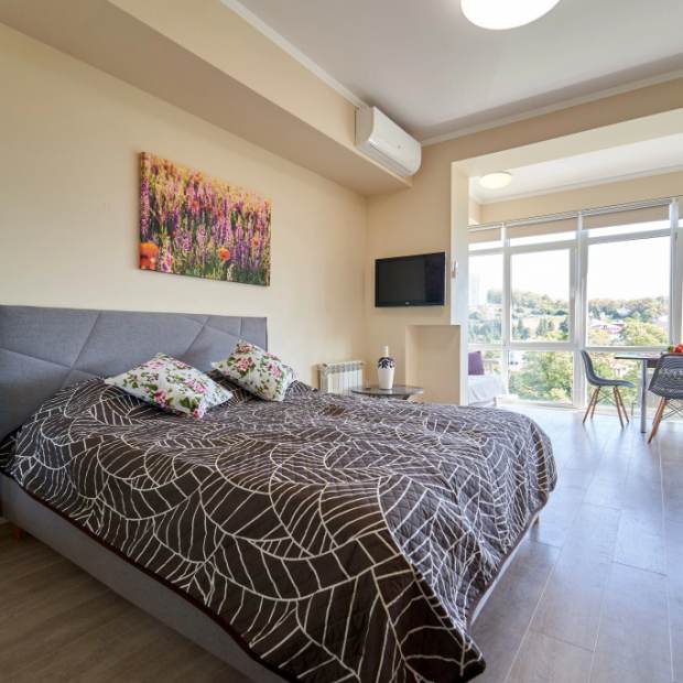Апартаменты Fancy Studio располагаются в Сочи. На первом этаже дома есть продуктовый магазин. Центральная набережная находится в 1,63 км, дендрарий — в 1,29 км, а музей «Дерево дружбы» — в 450 м. В 800 м от дома начинается терренкур «Тропа здоровья», который тянется на 4,5 км вдоль моря в сторону Мацесты. Апартаменты вмещают до 4 взрослых и 2 детей (с доплатой). В гостиной установлены двуспальная кровать 160×200 см и два дивана-кровати 140×200 см. Из панорамных окон открывается вид на лес и горы. Балкона нет. Имеются необходимые удобства от фена до посудомойки и стиральной машины. Есть кондиционер, а также плотные ролл-шторы.