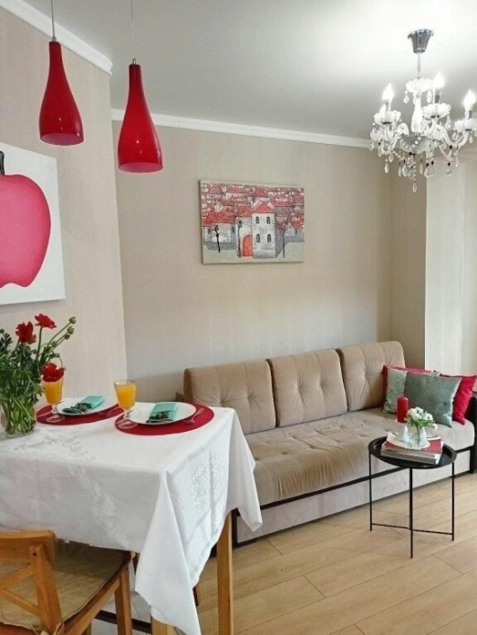 «Апартаменты Red Apple в Сочи» находятся в центре Сочи. В шаговой доступности расположены магазины: «Перекрёсток», «Магнит», а также аптека и отделение «Сбербанк». Рядом с апартаментами — бесплатный пляж «Маяк», парк «Ривьера», центральный рынок, кафе, рестораны и магазины одежды. Добраться до железнорожного вокзала можно пешком. Ближайшая остановка — «Сбербанк». В двухкомнатной квартире с гостиной, зоной кухни и отдельной спальней с дверью и окном могут разместиться 4 человека, включая детей и младенцев. В квартире гостей ждут открытый балкон с мебелью, санузел с душевой кабиной, имеется водонагреватель на случай отключения центрального горячего водоснабжения, фен, гладильная доска, утюг. На кухне холодильник, индукционная плита, СВЧ совмещена с электродуховкой, электрический чайник, необходимая посуда для приготовления и сервировки. В квартире 2 телевизора, 2 кондиционера. Постельное бельё, полотенца предоставляются и входят в стоимость. Бесплатный Wi-Fi, в 100 м можно поставить машину на платной парковке. При необходимости предоставляются документы.