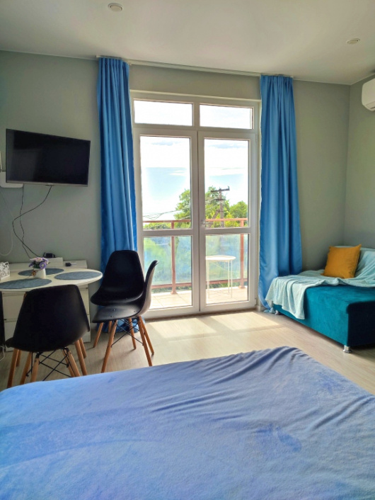 Апартаменты «С видом на море» находятся в Хосте. Неподалёку — самшитовая роща, малый Ахун, дача Сталина, Агурское ущелье, Орлиные скалы, пляж Красный штурм, пляж Спутник. В шаговой доступности расположены магазины и остановка наземного транспорта. В зимний период можно покататься на горнолыжном спуске. Для гостей доступны: телевизор, кондиционер, оборудованная кухня, бытовая техника, холодильник, микроволновая печь, чайник, кухонная посуда, санузел, фен, полотенца, мыло, шампунь, кровать, комод, шкаф в коридоре. Также есть обеденная зона. Апартаменты подходят для размещения 4 гостей. В квартире имеется двуспальная кровать и двуспальный диван.