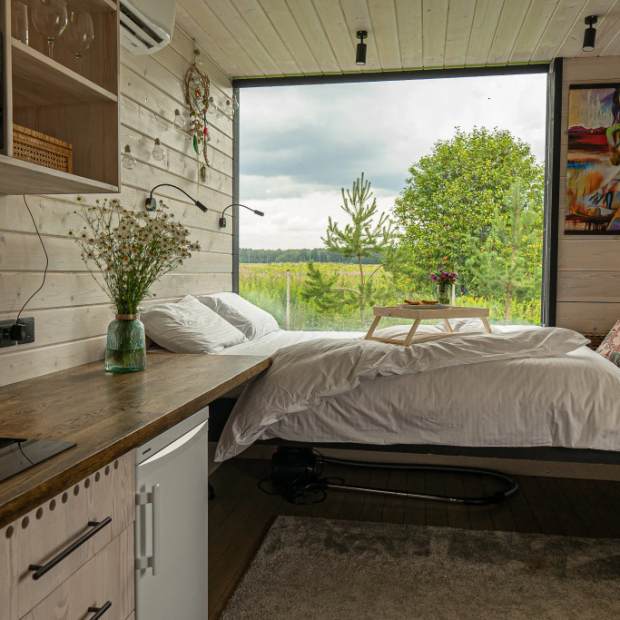 Двухместный коттедж с красивым видом из окна двуспальная кровать