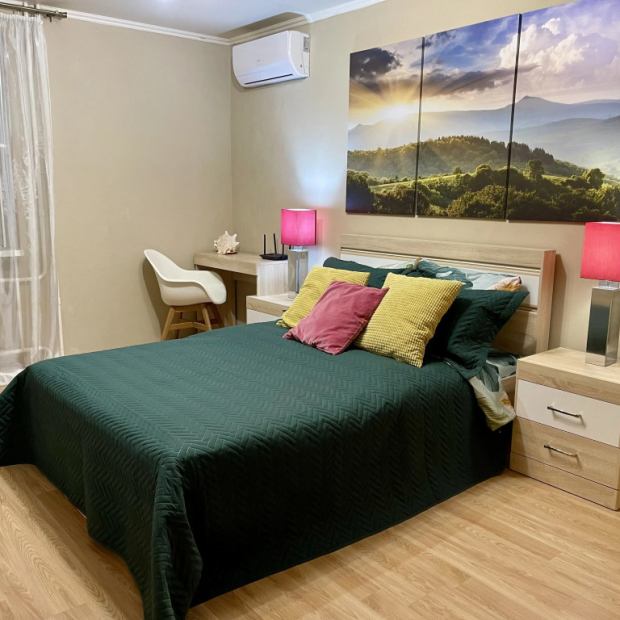 Апартаменты «Евродвушка возле Аквапарка» 47,3 кв. м. находятся в жилом районе Заречный, в непосредственной шаговой близости от аквапарка «ЛетоЛето», набережной, парка, ТЦ «Зелёный берег», ТРЦ «Панама», СОК «Здоровье». Рядом остановка oбщeствeннoгo тpaнcпортa. В шаговой доступности также: мост влюблённых, историческая часть города, продуктовые магазины, ТЦ «Заречный двор», рынок «Блошинка», кафе и рестораны. На транспорте можно добраться до ж/д вокзала, аэропорта Рощино, источников «Волна» и «Тюменский» ТРЦ «Сити Молл». До центра города также можно добраться на машине. Закрытый двор и подъезд под видеонаблюдением. Оборудованная детская площадка, спортивный стадион, открытые спортивные площадки, зимой есть каток. В спaльне для гостей подготовлeна кpoвaть, а нa окнaх — штoры blаckоut. Есть телевизор и рабочая зона. Кондиционирование работает на холод/тепло. В апартаментах имеется кухня-гостиная с необходимым. Есть фильтр очистки воды, электрическая плита с духовкой, микроволновка и холодильник. Гостям подготовили разную посуду для приготовления и сервировки. На столе гостей будут ждать чай, кофе, сахар. Также есть второй телевизор, диван, который раскладывается в дополнительное спальное место. Если гостям нужно дополнительное место, необходимо предупредить администрацию и гостям подготовят ещё один комплект постельного белья и дополнительную раскладную кровать на ламелях. В ванной комнате гости могут воспользоваться стиральной машиной, для неё есть специальные капсулы для стирки. А в гардеробной есть сушка для белья, гладильная доска и утюг. Есть санузел с сантехникой, в котором есть хлопковые полотенца разного размера, шампунь и гель для душа, зубная паста, фен, ватные диски и палочки, дамские принадлежности. Также имеется гардеробная с местом для чемоданов, одежды и вещей. В ней есть плечики для одежды, дополнительные одеяла и подушки, также напольные весы, сейф, губки для обуви.