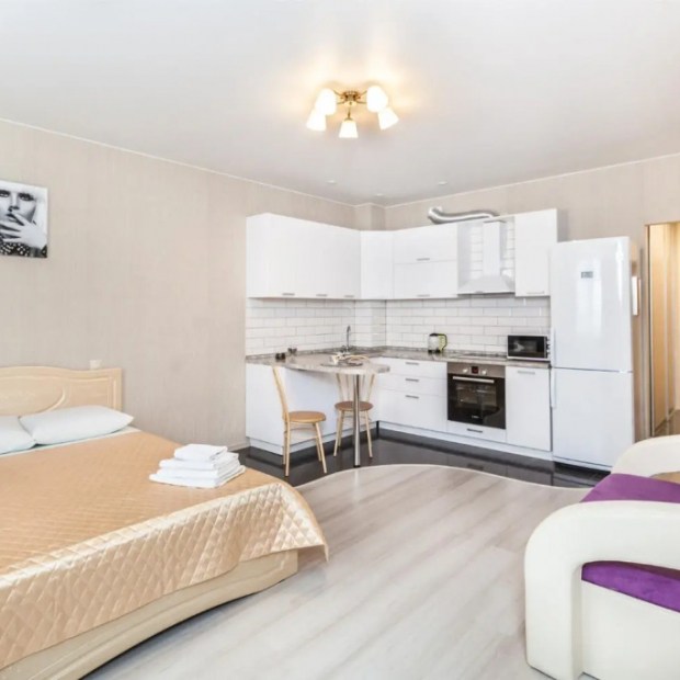 «Апартаменты-студия с кондиционером в новостройке» расположены в Тюмени. Рядом есть транспортная развязка, магазины и остановки общественного транспорта. В шаговой доступности находится кадетское училище. Шаговая доступность от кадетского училища. Отсюда можно добраться до железнодорожного вокзала и аэропорта. Дом расположен на закрытой территории. Есть детская площадка. В апартаментах 4 спальных места: двуспальная кровать и раскладной диван. Апартаменты оборудованы необходимым для комфортного проживания: постельное бельё, полотенца, мыльные принадлежности, кондиционер, фен, утюг, чайник, микроволновая печь, телевизор, стиральная машина и посуда. Доступен безлимитный Wi-Fi.