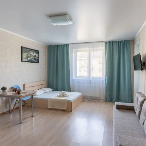 Апартаменты студия в новом доме находятся в центре Тюмени. В шаговой доступности находятся центральная улица Республики, дворец культуры «Строитель» и выставочный зал. Апартаменты находятся на закрытой территории. В апартаментах предусмотрено четыре спальных места: двуспальная кровать и диван. Гостям предоставляется всё необходимое для комфортного проживания: постельное бельё, полотенца, мыльные принадлежности, фен, утюг, чайник, безлимитный Wi-Fi, микроволновая печь, стиральная машина, посуда и телевизор.