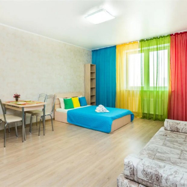 Апартаменты студия в ярких тонах находятся в центре Тюмени. В шаговой доступности находятся центральная улица Республики, дворец культуры «Строитель» и выставочный зал. Апартаменты находятся на закрытой территории. В апартаментах предусмотрено четыре спальных места: двуспальная кровать и диван. Гостям предоставляется всё необходимое для комфортного проживания: постельное бельё, полотенца, мыльные принадлежности, фен, утюг, чайник, безлимитный Wi-Fi, микроволновая печь, стиральная машина, посуда и телевизор.