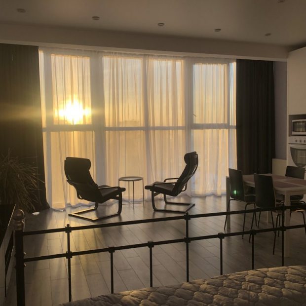 Квартира «Просторная Студия с Панорамными Окнами в Центре» находится в центре Тюмени, в доме с закрытым двором. В шаговой доступности находятся: ТРЦ «Вояж», Цветной бульвар, ЦУМ, Цирк, железнодорожный вокзал и множество различных кафе и ресторанов. Также в окрестностях находится набережная и Мост влюблённых. В доме находится продуктовый супермаркет. Квартира является студией 51.1 кв. м. Отличительная особенность квартиры — это панорамные окна. В квартире имеется одна двуспальная кровать и одна односпальная раскладная кровать. Также гостям предоставляется постельное бельё, полотенца, необходимая техника, посуда для приготовления еды, гладильная доска, утюг, фен, сушилка для одежды, фильтр с питьевой водой, шампунь, кондиционер, гель для душа, жидкое мыло, ватные палочки, ватные диски, средство для удаления макияжа, туалетная бумага, освежитель воздуха.