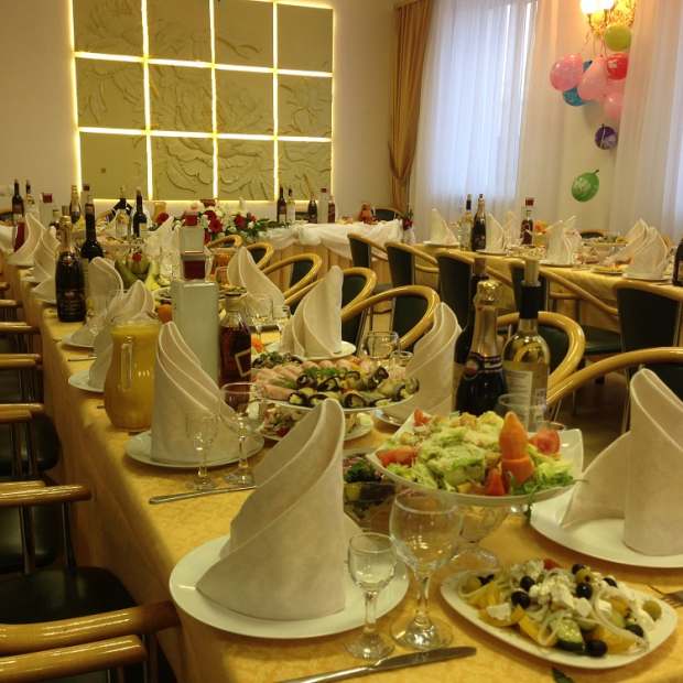 Уютный камерный банкетный зал на 50 человек расположен на первом этаже одноименного отеля. Зал оснащён профессиональной световой аппаратурой, подходящей для проведения дискотек и художественного освещения Вашего торжества. Для Вас - обширное банкетное меню на самый взыскательный вкус! В меню представлены как классические блюда славянской кухни во всем многообразии, так и изысканные блюда кухонь разных стран мира, которые с удовольствием приготовят для Вас. У нас Вы можете отпраздновать свой корпоратив, свадьбу, праздничный банкет по случаю дня рождения, или просто отметить компанией любую памятную для Вас дату с теплом и уютом, наслаждаясь вкусной едой и приятным сервисом!