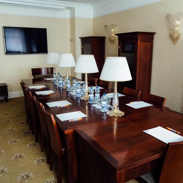 Зал для переговоров вместимостью до 15 человек идеально подходит для проведения небольших семинаров, совещаний и презентаций, оснащен мультимедийным проектором, экраном для проектора, ТV-тюнером, флипчартом.