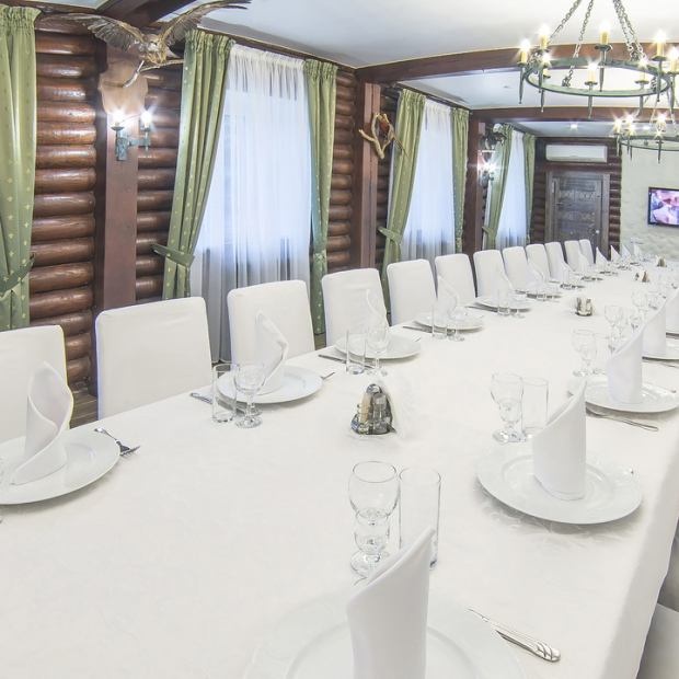 Ресторанный зал Соколиный - это один из самых изысканных залов комплекса, выполненный в экостиле. В оформлении присутствуют благородное дерево, натуральные камни, экспонаты настоящих диких животных и птиц. Камерный зал вместимостью до 40 человек отличается своей многофункциональностью. К услугам гостей выдвижной экран и профессиональная звуковая система. Идеальная площадка для проведения праздничного ужина, делового обеда или презентации.