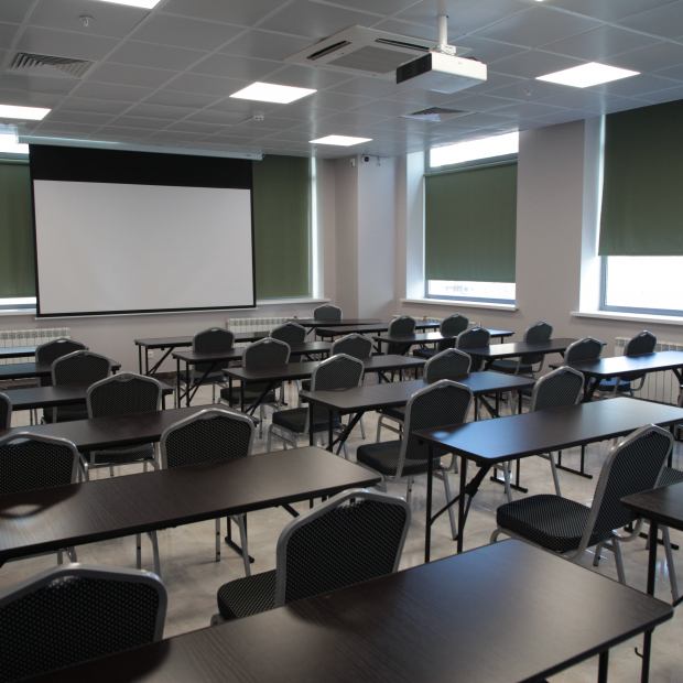 Благодаря пяти широким оконным проёмам этот зал имеет хорошее естественное освещение, но при необходимости все окна могут быть закрыты плотными шторами. Зал подходит, как для учебных занятий, так и для небольших презентационных мероприятий. Из стационарного оборудования в конференц-зале имеется: экран шириной 280 см, проектор с высоким разрешением и звукоусилительная аппаратура.