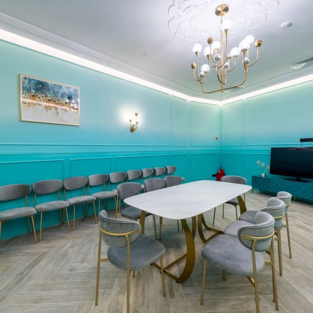 Переговорная «Диалог» оформлена в соответствии с ключевыми принципами стиля дизайна Art déco. Яркий бирюзовый градиент на стенах изысканно соседствует с креслами в форме "ракушки" и светильниками с оригинальной геометрией.