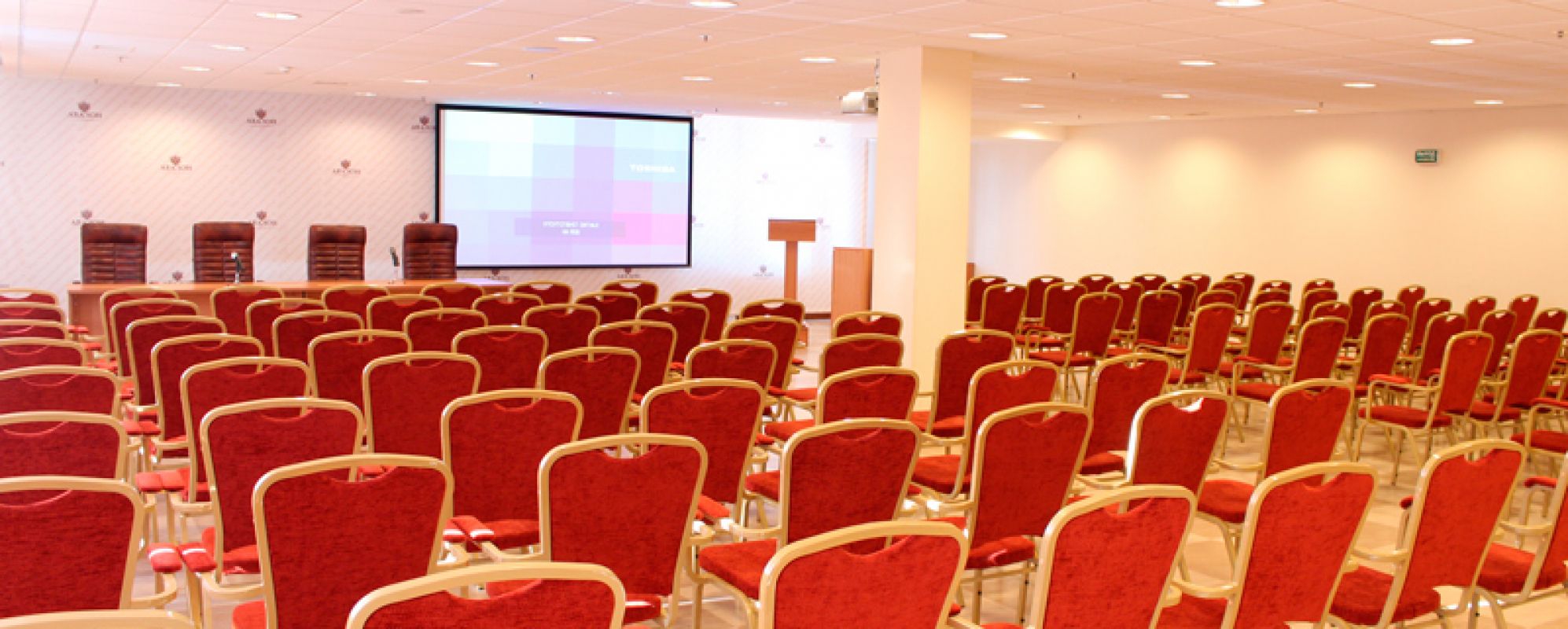 Оборудование зала: экран (300*160), мультимедийный проектор, акустическая система, беспроводные микрофоны, беспроводной высокоскоростной доступ в Интернет, телефон, магнитно-маркерная доска, система микроклимат.