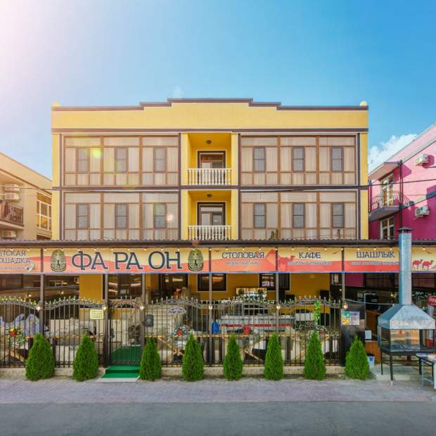 Отель Фараон располагается в курортном городе Анапа, возле ручья Можепсин. На территории гостиницы имеется просторная и комфортная зона отдыха, обустроенная крытыми беседками и лежаками для принятия солнечных ванн. На крыше гостей ждет большой плавательный бассейн с прекрасным пейзажем. Для детей предусмотрена игровая площадка с качелями. Апартаменты различной категории с широким ассортиментом номеров, оснащенных двуспальными и односпальными кроватями, мягкой мебелью в виде диванов и кресел, телевизорами и чайниками. Постояльцам предоставлены отдельные санузлы с душем и полотенцами. Пообедать предлагается в собственном ресторане, где будут ожидать вкусные и сытные обеды, прохладительные напитки и приветливые сотрудники. За дополнительную плату есть возможность организовать барбекю, для тех кто любит блюда на мангале. В 10 минутах ходьбы расположен пляжный, развлекательный Детский центр и Черноморское побережье.