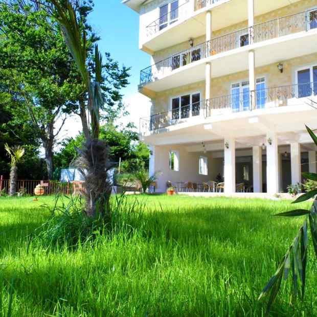 Отель расположен в 100 метрах от уреза воды на высоком берегу (около 50 метров). Никаких автодорог, шума, пыли, людных мест и развлекательных заведений рядом нет! Только звенящая тишина, шум прибоя, пение птиц и ароматы субтропических растений. Собственный выход к морю. Пляж широкий, галечный, чистый и немноголюдный. Большая территория с зонами отдыха. Много цветов и зелени.