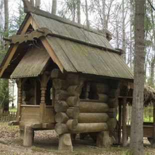 Избушка на курьих ножках - памятник архитектуры конца XIX века. Она расположена на территории усадьбы Абрамцево. Архитектор В.М. Васнецов построил избу для детей С.И. Мамонтова, который тогда владел усадьбой, а также для детей отдыхавших здесь художников. Основой для строительства избушки послужил сруб из толстых бревен, который опирается на пни. Верх его покрывает двускатная тесовая крыша с коньком, декорированная резной головой коня. К северной стороне сруба примыкают сени на столбах и покрытые соломой, а к южной – балкончик под односкатной тесовой кровлей. Избушку украшают изображения совы и летучей мыши, ставшие популярными элементами русского модерна.