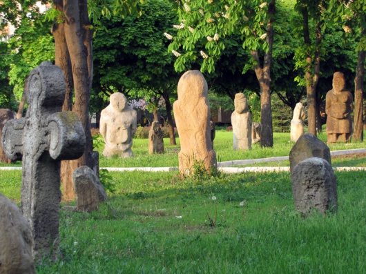Скифские (каменные) бабы - крупнейшая в Украине коллекция древних каменных изваяний, расположенная у стен исторического музея Днепропетровска. Уникальная экспозиция привлекает внимание посетителей музея и гостей города своей потусторонней экзотикой. Это одна из самых больших коллекций древней каменной пластики на Украине - 80 статуй. Поражает не только количество изваяний, но и их хронологическое и культурное разнообразие. В коллекции есть антропоморфные стелы эпохи энеолита (III тысячелетие до н.э.), причем, как простейшие, так и уникальные, аналогий которым нет ни в одном европейском музее - Натальевское и Керносовское изваяния. Оригинальные скифские статуи VI - IV вв. до н.э. Но господствуют в коллекции, конечно, средневековые половецкие статуи, которых в коллекции аж 67. Именно их облик, своеобразные черты, прежде всего, остаются в памяти посетителей музея, именно им все каменные статуи южноукраинских степей обязаны своим названием - "бабы", (от тюркского "вава" - предок, дед). Каменные бабы стояли не на пустом месте, они являлись органичной частью поминальных-погребальных святилищ, архитектура которых от эпохи энеолита (времени их появления на курганах) до средневековья отличалась простотой и выразительностью. Каменные бабы сделаны из камня: песчаник, известняк, гранит. Некоторые из статуй представляют прямой каменный столб с изображением человеческого лица. На других статуях обозначена не только голова, а и туловище, руки, ноги, и даже головной убор.