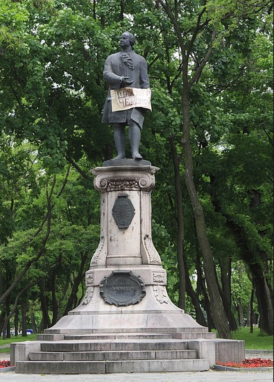 На пьедестале, где сейчас стоит памятник Ломоносову, в 1914 году была установлена статуя Екатерины II. После Октябрьской революции эта статуя была сброшена с пьедестала и некоторое время хранилась в историческом музее, а во время второй мировой войны бесследно исчезла. Памятник М. В. Ломоносову в Днепропетровске был открыт 25 июня 1971 года. Михаил Васильевич Ломоносов (1711-1765гг.) – первый русский ученый-естествоиспытатель мирового значения, поэт, художник, историк. Главным сочинением Ломоносова по языку была Российская грамматика, написанная в 1755 году и выдержавшая 14 изданий. Большое значение имело произведение Михаила Васильевича Ломоноса стилистическое нормирование русского языка.