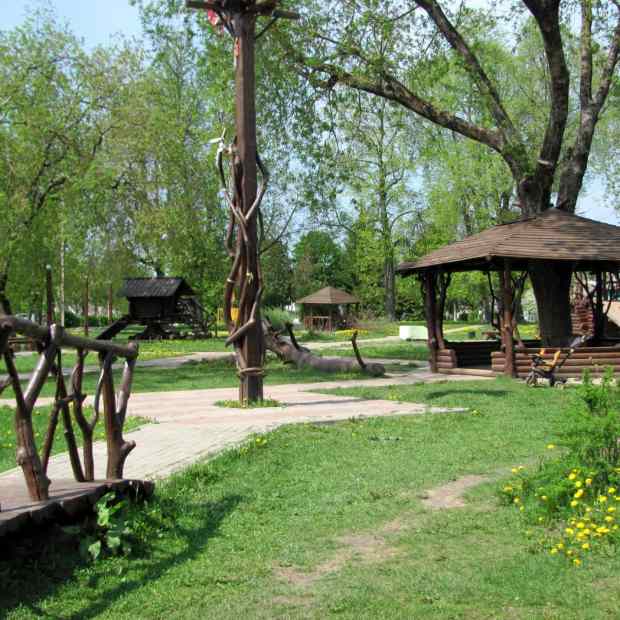 Детский парк Сказка создан при участии местного жителя города Евгений Яшечкина, который своими руками выпилил, смастерил из коряг и бревен затейливые фигуры сказочных персонажей и соответствующий антураж.Развлекательный парк для детей с беседками, резными избушками и альпийской горкой. На всей территории установлены лавочки, в центре установлен мостик и памятный знак для молодоженов.Рядом расположена уличная спортивная площадка.