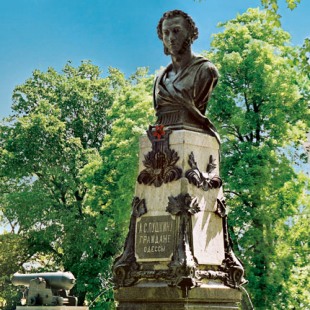 Памятник А.С.Пушкину в Одессе является первым в Украине и вторым в Российской империи. Памятник был открыт на Приморском бульваре в 1889 году. Авторы скульптуры - Ж.Полонская, архитектор А.Васильев. Бюст поэта выполнен из бронзы и установлен на гранитный постамент, окруженный четырьмя чугунными чашами фонтанов, а на его гранях расположились крупные морские рыбы. По портретному сходству этот памятник считается одним из лучших. Пушкин жил в Одессе чуть больше года с 1823-1824 гг. Он воспел Одессу в своих стихах. Улица, на которой он жил тогда, называлась Итальянской (ныне Пушкинская). Оживляют вид памятника расположенные по бокам граненные цветочные клумбы.