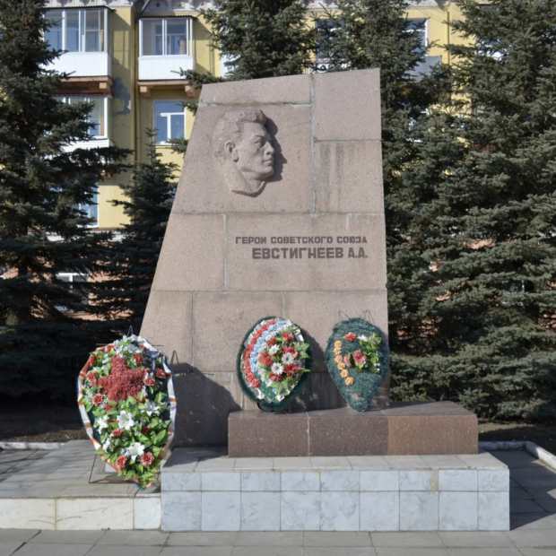 Памятник Герою советского Союза и уроженцу Верхней Салды А. А. Евстигнееву установлен в мае 1967 года. Ефрейтор Евстигнеев, продвигаясь в составе дивизиона в направлении села Тихоновка, 14 января 1944 года оказался в окружении. Противник бросил в атаку до 200 автоматчиков при поддержке танков. Расчёт ефрейтора Евстигнеева при отражении контратаки противника подбил танк и уничтожил до взвода вражеских солдат. 25 января 1944 года после пяти массированных налётов противник снова бросил в атаку танки. Ефрейтор Евстигнеев, будучи раненым, выкатил орудие на прямую наводку и уничтожил роту противника, подбил два танка и два самоходных орудия. Погиб в этом бою.